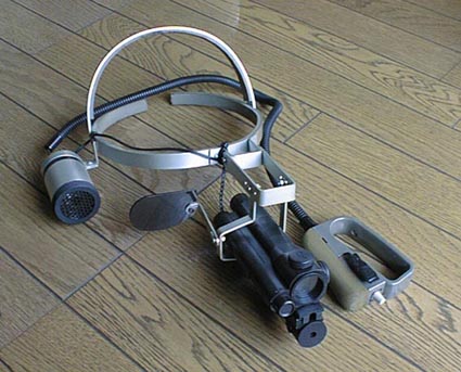 写真でもわかるように装置を頭にかぶりグリップのボタンを押すとレーザーが発射されます。 仕組みはダットサイト(目標に赤い光点が写る照準器)とレーザー照準器を組み合わせ、カラスの注意を引くためにドラエモンの声で「ぼくドラエモン!」と叫ぶスピーカーを取り付けてあります。 まずゴミカラスを見つけたらドラエモンの声を流し(この声がひどく大きい!)、カラスがこっちをむいたらすかさずダットサイトで狙いをつけてレーザーを発射します。 何に驚くのかは聞いてみないと判りませんが、とにかく慌てて逃げていきます。 |