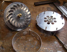 手始めにアルミの円盤に放射状の切り込みを入れひねってプロペラの様にしたものに蒸気を当てて回してみました。 無負荷では高速回転しますが負荷をかけるとかなりスロー回転に、ブレードの曲げ方を変えたり蒸気の当たる位置を変えたり、ベルトで減速してみたり、でもあまり代わり映えしません。 幸い手元の古い本に載っていた自家用水車の中に「ミッチェルタービン」という水車がありました。 さっそく作り変えてみたところ少しましな状態になりましたが、それでも目標の空を飛ぶまでは程遠い状態。ノズルの角度を変えたり穴の大きさを0.1mm単位で変えてみたり、ボイラーの火皿を大きくしてみたり、スーパーヒーターを強化したりなんかしたりして・・・ 結論 !! このタービンで空は飛べそうもありません。トホホホホ・・・・ |