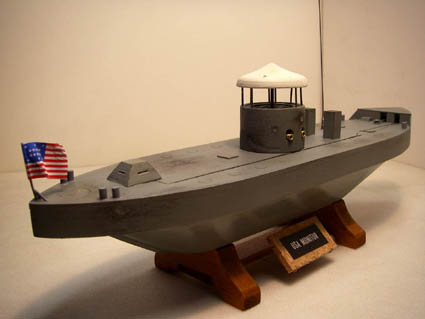 ●「バージニア」 南軍の船でもともと長さ84mの北軍の機帆船「メリマック」の焼け残った船体を利用して作られた船です。水面に出ている部分と言えば傾斜した壁に囲まれた構造物に一本の煙突が突き出ているだけでマストも何もありませんでした。 この構造物の中には大小10門の大砲が据え付けられ、鉄で被われた70センチ余りの厚い壁で敵の砲弾から守られていました。 最近のステルス性を取り入れた軍艦も、レーダー電波と鉄の砲弾の違いはあるものの、弾きかえすために傾斜した壁が効果的な方法として使われているのは面白いことです。 この模型のプロポーションは実物に近くなっていますが部分的には同じではありません。 |