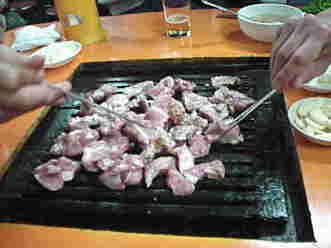 勇気を出してお店に突撃の提督達。案の定日本語は通じない。壁に掛けてあるメニューを見る。まったく読めない。どうする提督達。でも、大丈夫だった。何と、このお店にはメニューは一種類しかなかったのである。豚肉の塩焼き。これなら平気である。とりあえず3人前頼む。指を3立てる。こちらの焼肉は量が多いことを昨日学習していたので、とりあえず3人前。通じたぞ。ビールはビールだから、ビールと言いながら3本指を立てる。おお、これも通じた。大丈夫だ。いける。とりあえず食べる。やはり素のままの肉を焼き、ごま油に塩を入れたたれで食べる。キムチは頼まなくてもいくらでも出てくる。サンチュも頼まなくてもいくらでも出てくる。うーん、良いシステムだ。提督は、たばこを吸わないのだが、残りのメンバーはかなりのヘビースモーカーである。たばこを吸うために灰皿が欲しくなる。初めに英語で頼んでみる。お店のおばちゃんには通じない。で、仕方がないので、一人がたばこを吸って灰を落とす身振りをする。おばちゃんは納得して引っ込むと、たばこを持って現れた。そこで、もう一度同じしぐさを大袈裟にすると、今度はマッチをもって現れた。うーん、なかなか手強い。再度挑戦で、やっと灰皿が手元に。大丈夫だ。韓国でも提督たちは生きていける。で、ビールを飲み終わり、周りを見回せば、どのテーブルも飲んでいるお酒はジンロ。そうかあ、韓国にきたらジンロなんだなあ。でも、割って飲んでいるような雰囲気は何処にもない。みんな、ガラスでできた日本のぐい飲みのようなものでジンロを飲んでいる。そうか、ジンロはストレートで飲むお酒だったのだ。提督は甘かった。地元の店で、提督はジンロをロックで飲むのが好きでいつもそうしていた。お店のママさんには、ジンロをロックでグビグビ飲むのは提督さんだけだ。提督さんってお酒強いんですね。と、おだてられていたが、そんなものは全然甘いんだな。よし、提督もジンロを飲むぞ。みんなに賛同を求めたが、みんなもその気十分だ。お店の人に向かい手を挙げ、「ジンロ」と言って指を二本上げた。一発で通じた。ぐい飲みを四つテーブルに置き、ジンロを二本置き、おばちゃんは、「ジーロ」と発音を直し去っていった。そーか、ジーロと発音するのか。で、韓国式ぐい飲みでジーロを飲み始める四人。みなさん、美味いのであるこれが。日本で買う普通のジンロに比べてほのかに甘いのだよ。うん、これは良いお酒だ。良いことを知った。当然お酒も2本で足りるはずもなく4本め、6本目と増えていく。肉も追加した。いやー、満足だ。で、立ち上がってかえるそぶりをすると、おばちゃんがメモ紙にお勘定を書いて持ってきた。当然明細はない。グランドトータルだけの値段。いやー、見てびっくりの値段である。四人であれだけ飲んで食って4万4千ウォン。日本円にして4千4百円。一人千百円。まじかよ。安いよなあ。これが庶民の値段なんだ、ちなみに後から知るのだがジーロの値段はロッテ百貨店で650ウォン、コンビニで900ウォンから950ウォンである。とてもお安いお酒。日本だと同じ大きさのジンロが450円。ウォンに直すと4500ウォン。なめとんのか日本の値段。いくらなんでも7倍はないぞ、7倍は。