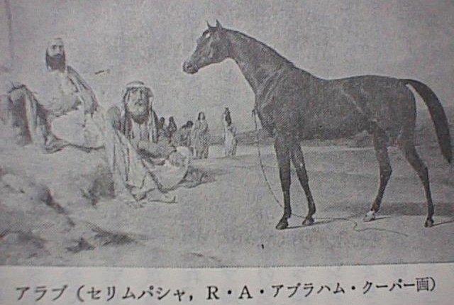 サラブレッドという種はアラブ馬を改良しながら出来あがった品種ですが、アラブ馬自身も人間によって意図的に作られた馬です。アラブ馬はアフリカのバルブ馬と北方の遊牧民の馬との混血ではないかと言われています。アラブ馬誕生の伝説は幾つかあり、その内の一つにイスラエルのソロモン王の話があります。ソロモン王は家畜の育成に強い関心を持っていて、遠くから七頭の優れた若馬を取り寄せました。そしてその馬と自分の牡馬とを海へ沈めました。ソロモン王の馬はすぐに死んでしまいましたが、七頭の馬は岸にたどり着きました。それらの馬が種牡馬となってアラブ種を生み出したというのです。ソロモン王はあまりにも馬に熱中してしまい、つい神様へのお祈りを忘れてしまいました。深く反省した王は六頭の牝馬を追放し神に許しを乞いました。後のアラブ種に時々出来そこないの馬が出るのはその時の子孫だといわれています。実際にアラブ種を育てたのはシナイ半島出身のベドヴィン族だとされています。